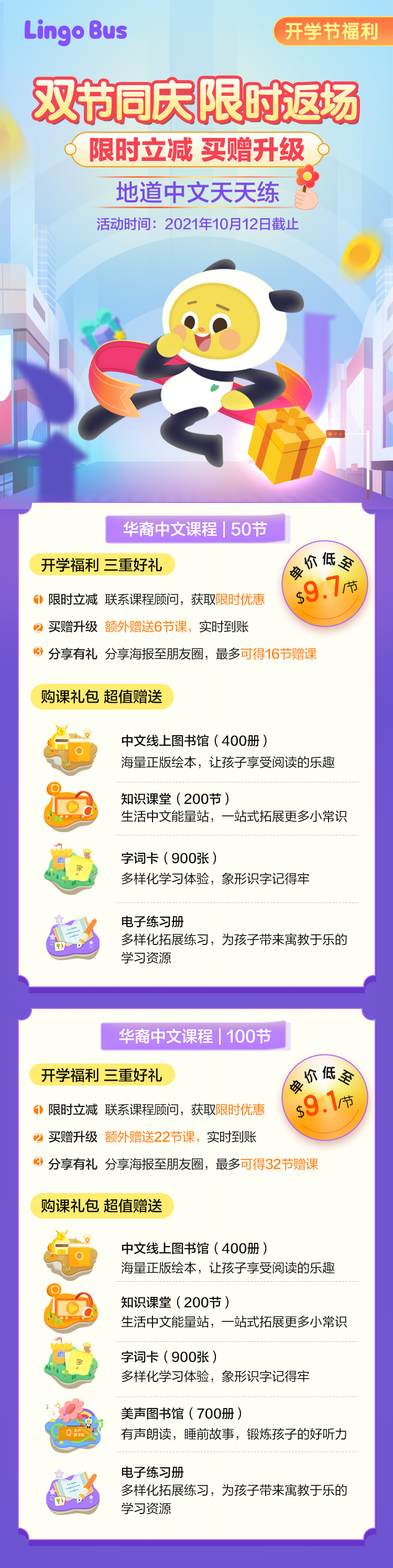 除优惠券折扣+课程包赠课外,您如果分享您的专属海报海报还能获得更多分享赠课哦!值得一提的是,Lingo Bus还为您准备了 与课程进度相适应的免费中文线上图书馆(400+)、知识课堂(200+)、字词卡(900+)、美声图书馆(700+)、电子练习册等多重好礼。